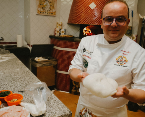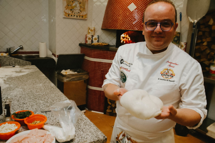 Raccomandazioni che valgono soprattutto se si vuole preparare una pizza con le varianti proposte da Pasqualino Rossi, cioè con patate e salsiccia o con patate e peperoni che fanno da schermo al calore irradiato dalle resistenze superiori. Una considerazione anche sul tipo di farina che scegliete. Pasqualino Rossi usa per la pizza nel ruoto una più rustica Ricca del Mulino Caputo e in questo caso vanno calcolati tempi più lunghi di maturazione e di lievitazione.